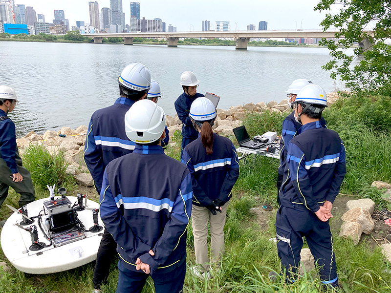 ビジネスプロデュース担当では、社会インフラの維持管理や運用に関わる自治体・企業(当社株主、大手エネルギー企業など)に対して、ドローンやAIなどの最先端技術を活用したソリューションの提案・導入支援を行っています。特に、上下水道、ダム、鉄道、道路などのメンテナンスに、新技術を活用した点検サービスの提案・展開を行い、社会インフラの効率的かつ高度な維持管理を支援しています。