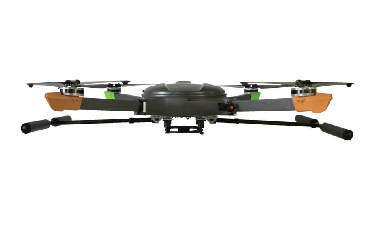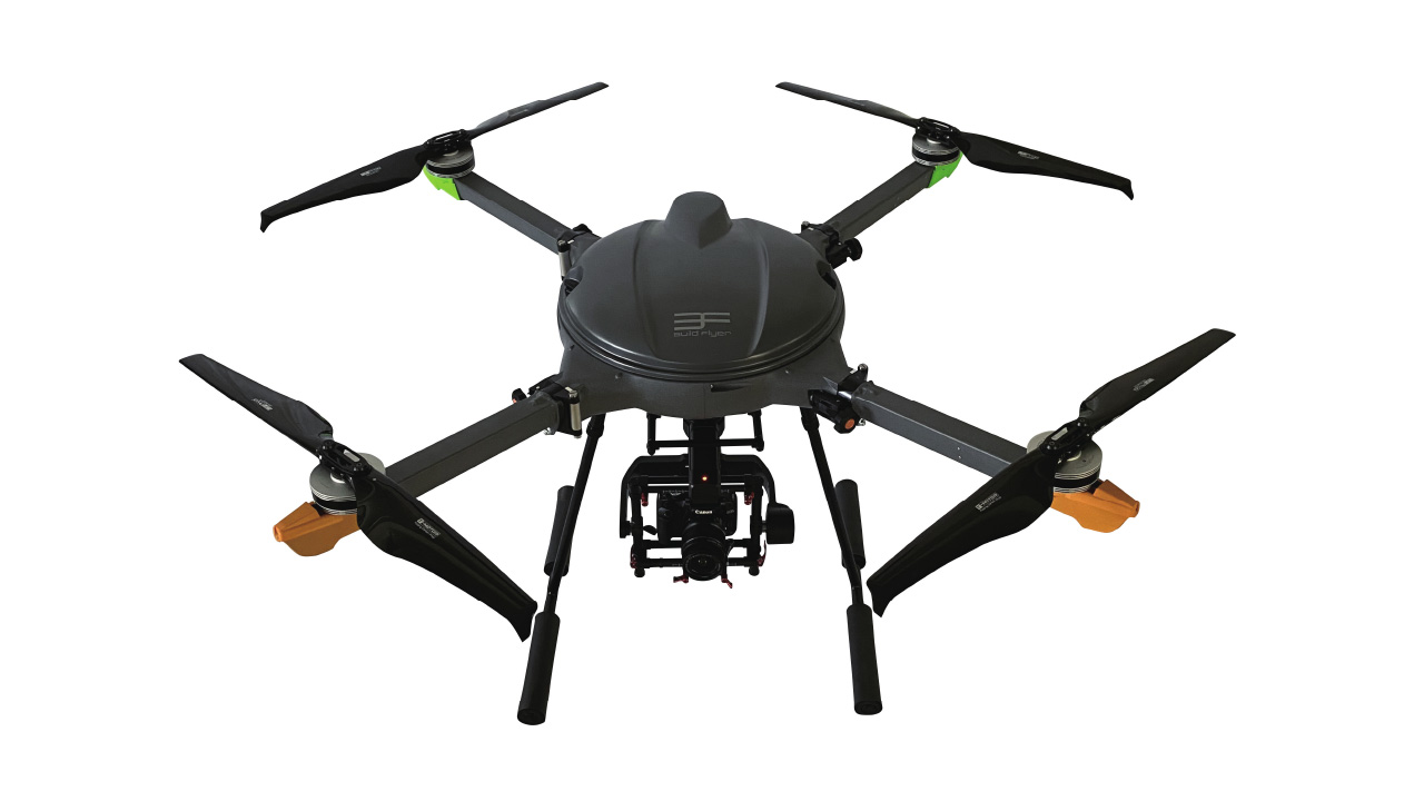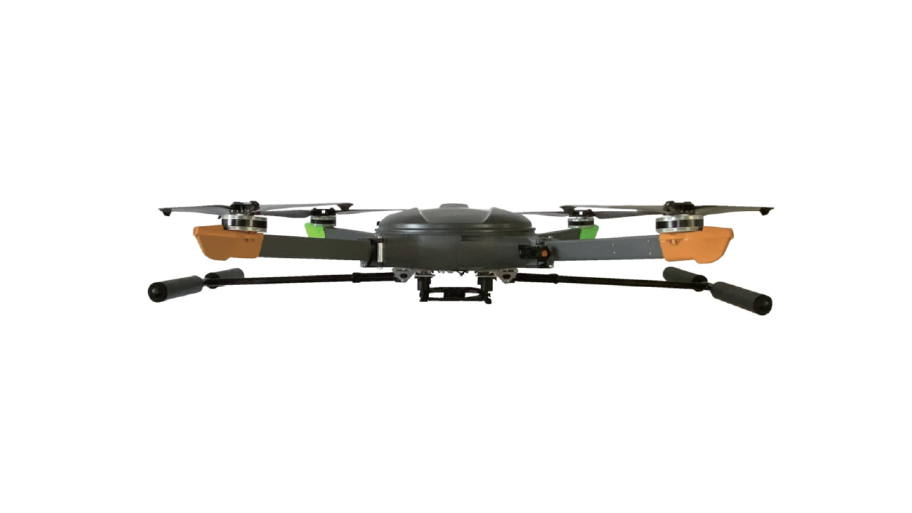 機体の軽量化や安定性、バッテリー効率などを精査し、ノーロードで45分、本格的な一眼レフカメラや測量用カメラなどの搭載を想定し、最大ペイロード5kgとしたフライトは25分という長時間飛行を可能とします。